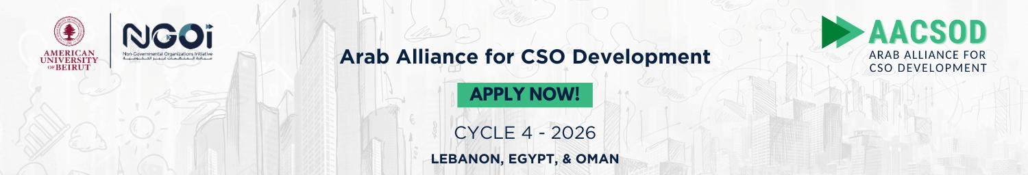 AACSOD is launching its fourth cycle of institutional strengthening and capacity building through which 15 CSOs will be selected to benefit from the program’s services over a period of 12-18 months. In this cycle, small to medium-sized CSOs based and operating in Lebanon, Egypt, or Oman are encouraged to apply to enroll in the AACSOD program starting January 2026. All the fees associated with the program’s services will be waived for the selected CSOs. A National Expert will be assigned to each selected CSO to support them throughout their development journey.
